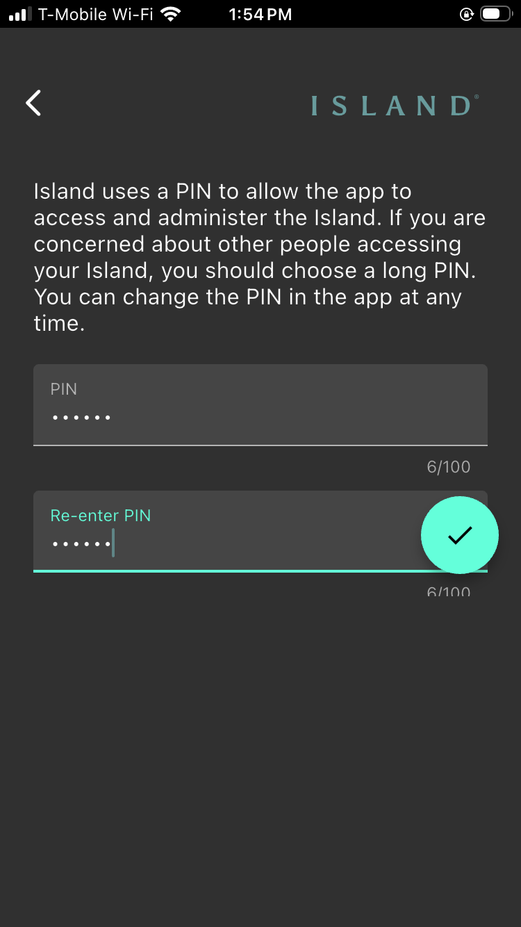 As soon as the PIN Is confirmed, the app restarts and immediately checks if the firmware on your Island is current. If prompted to update, respond “Yes”.